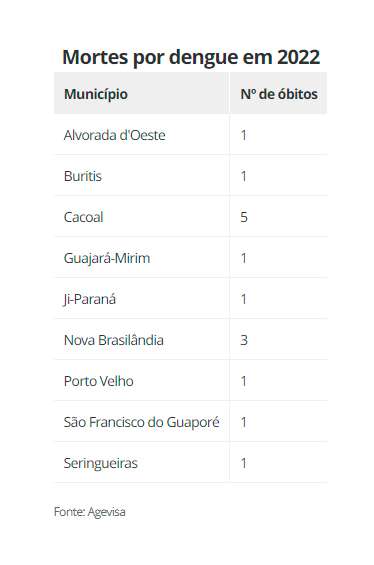 Entre julho de 2022 a janeiro de 2023, Santa Luzia do Oeste, Jaru, Alvorado do Oeste, Governador Jorge Teixeira, Alta Floresta do Oeste, São Felipe d’Oeste e Vilhena foram os municípios que tiveram a maior incidência de dengue, ficando acima dos 2 mil.